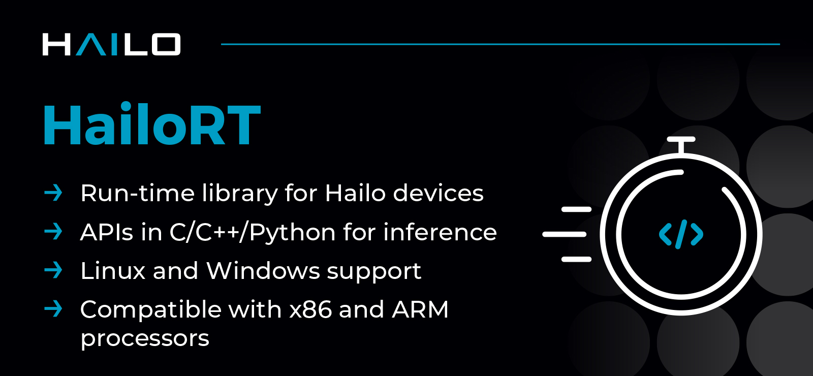 HailoRT is a lightweight, production-grade runtime library that runs on the host processor and provides a robust user-space library (the HailoRT Library) with intuitive APIs in C/C++ for optimized performance